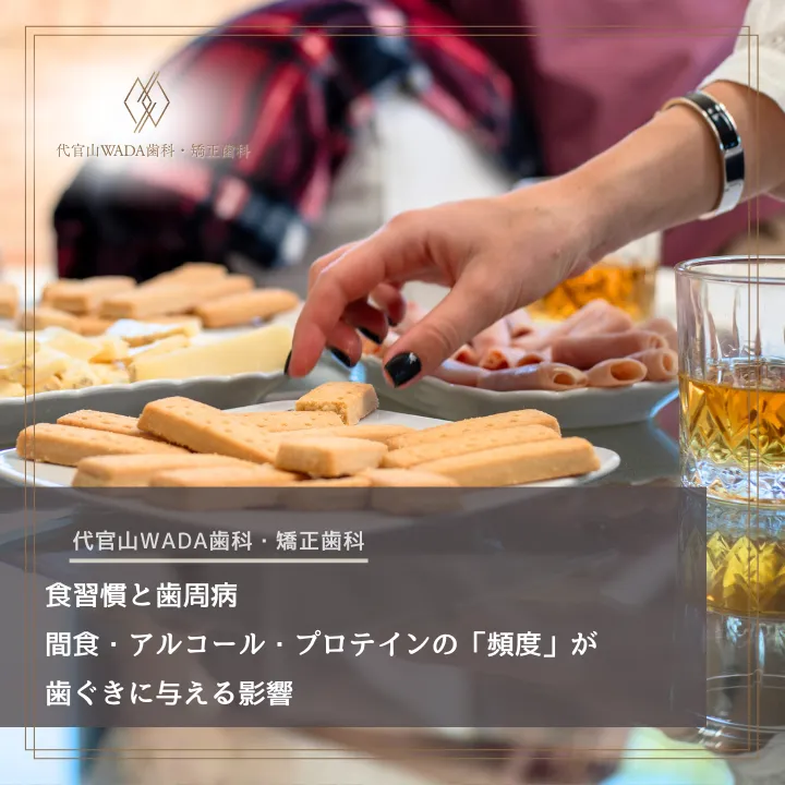 今回は、意外と見落としがちな「間食」「アルコール」、および近年健康のために摂取する方が増えている「プロテイン」の摂取頻度が、歯ぐきにどのような影響を与えるのかについて解説します。 正しい知識を持つことで、毎日の食事が「歯を悪くする習慣」から「健康を守る習慣」へと変わります。ぜひ最後までお読みください。